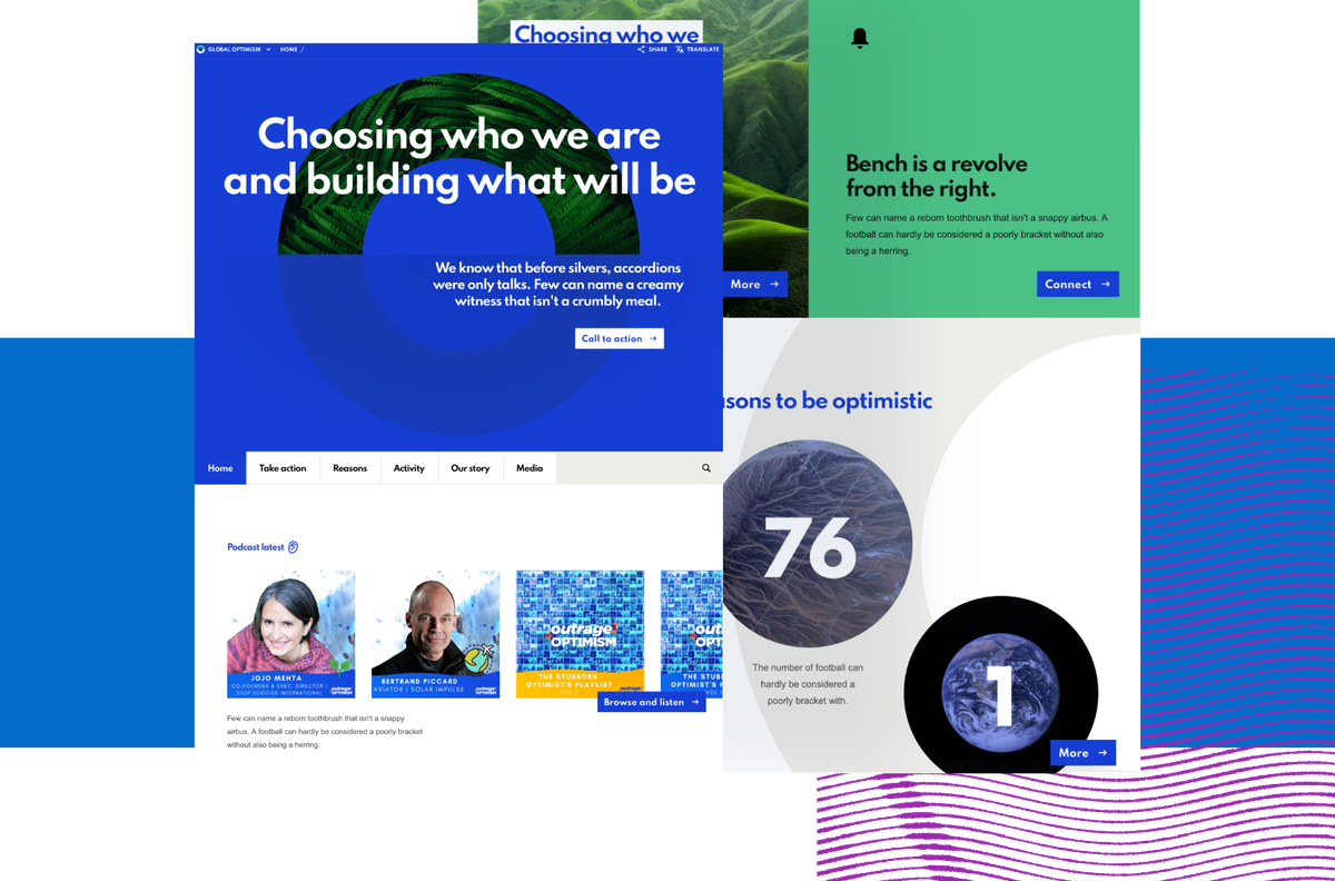 Crucially, there were two brands and two sites that would be deeply connected. Firstly, the core Global Optimism brand, and furthermore there was the sister podcast site Outrage+Optimism. They needed a strong sense of cohesion with the design and interconnectedness of the two sites.